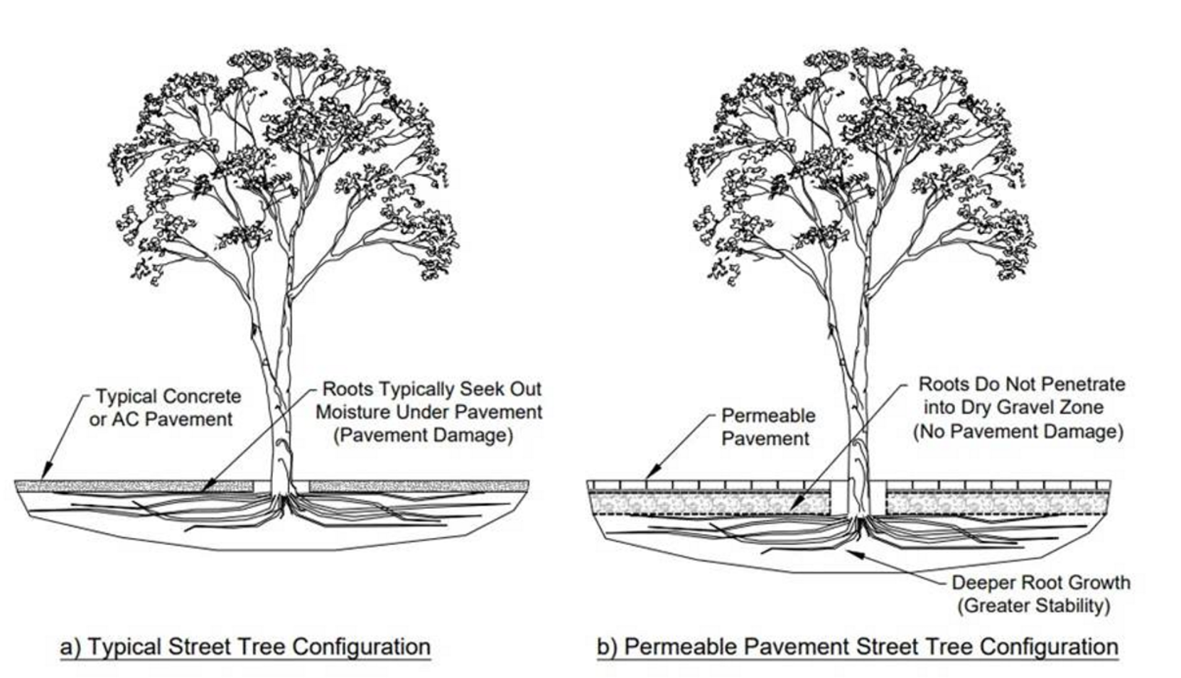 This condensation layer is attractive to tree roots, made only more attractive by trees’ limited access to water and minerals in the highly compacted soils found underneath impermeable pavements to support pavement loadings (Grabosky et al., 2009). Consequently, tree roots may push up against the pavement, causing cracking or other damage.