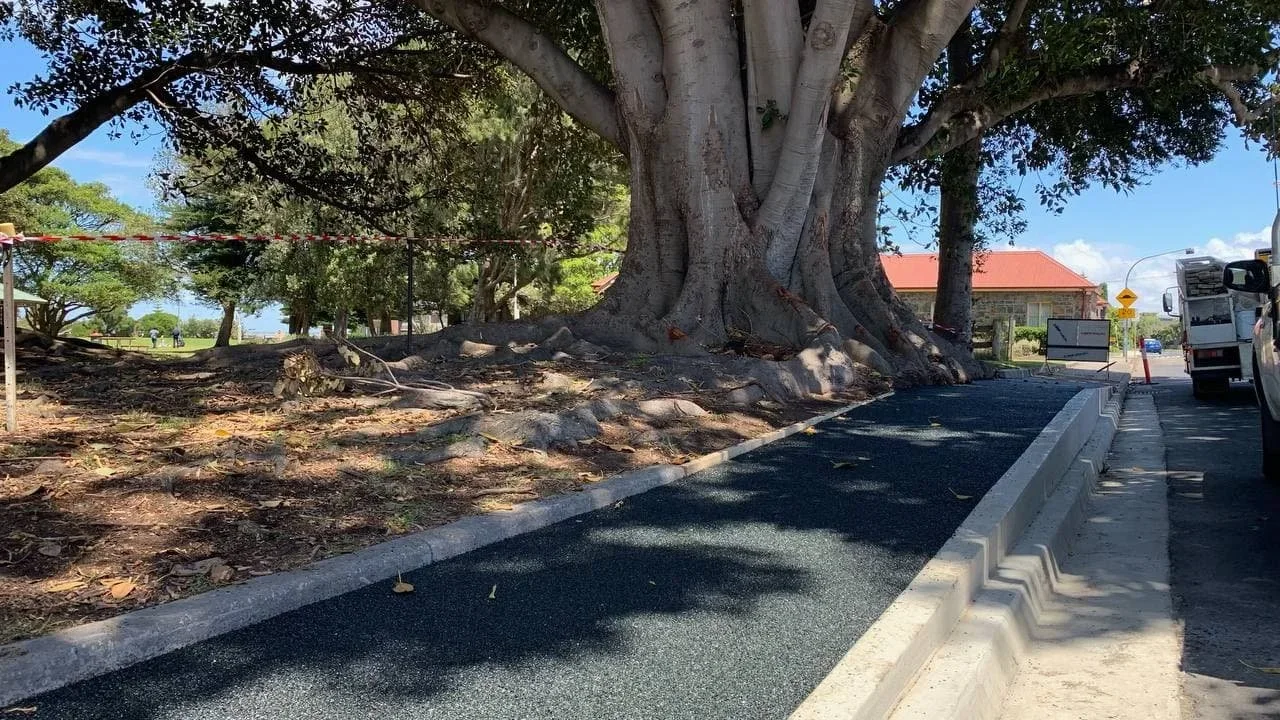 Description Installation of a Porous Lane footpath next to a large fig tree.